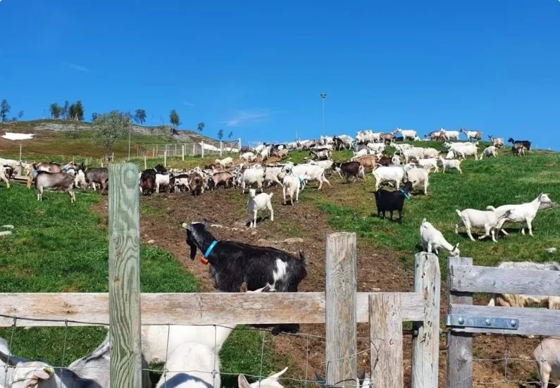 Geiteflokken koser seg på frodig beite i det fine sommerværet. Foto: Monica Helena Johansen